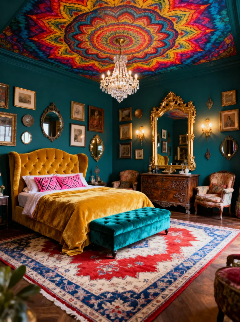 Okay, can we talk about that ceiling?! Most people just paint their ceiling white and forget about it, but this room uses it as a canvas for a massive, colorful mandala. It’s like sleeping under a kaleidoscope. Against those deep teal walls, the colors just pop like crazy.