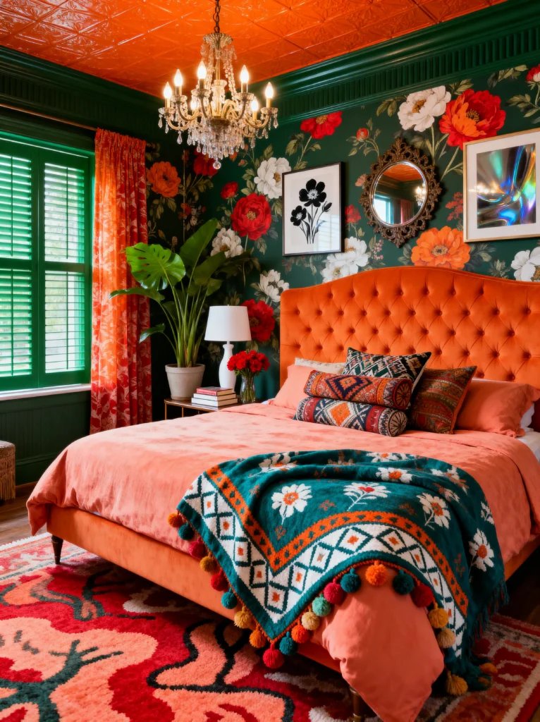 This room makes me feel like I’m waking up inside a tropical garden. That floral wallpaper is absolutely stunning—huge red and white blooms on a dark green background. It’s a big statement, so pairing it with an oversized orange tufted headboard was a genius move.
