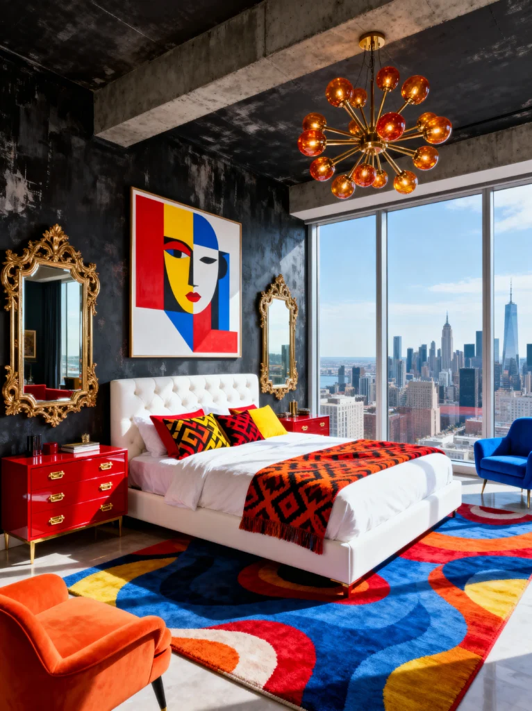 Then you have that pop of turquoise on the nightstand. Who would have thought to put teal next to primary red and yellow? But it works! It’s that “wrong-is-right” mentality that makes modern design so much fun. The yellow armchair by the window is the ultimate “main character” spot. Imagine sitting there with the New York City skyline as your backdrop—you’d feel like you’re at the center of the universe.
