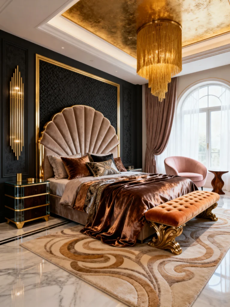 The ceiling is the real winner here with that gold leaf finish that reflects the light from the fringe chandelier. Everything feels soft and metallic at the same time. The color palette of chocolate brown, bronze, and dusty pink is so sophisticated. It’s the kind of room where you’d wear a silk robe and feel like royalty. It’s warm, glowing, and incredibly high-end.