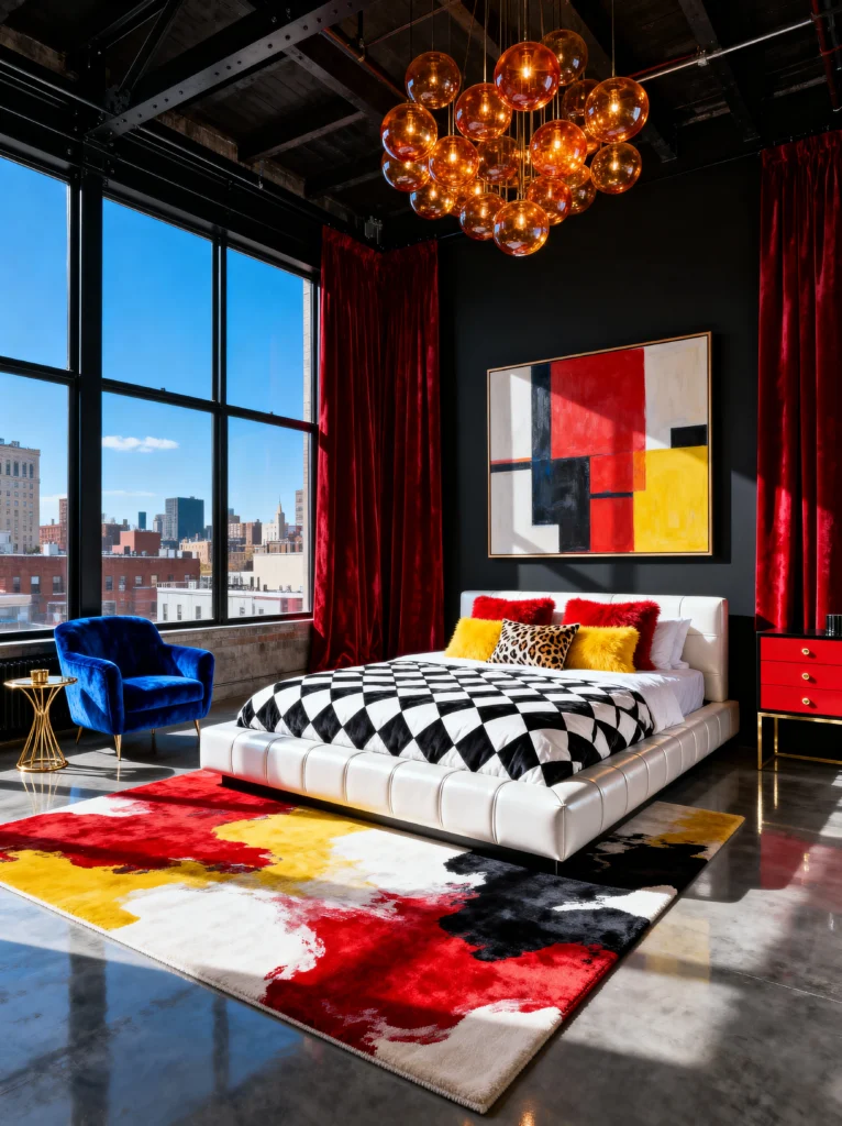The bed is kept simple in white leather, but the pillows bring in that pop of red and even a little leopard print. I love how they used the black wall to make the primary-colored artwork look like it’s floating. It’s a great example of how you can take a “cold” space like an industrial loft and make it feel vibrant and lived-in through bold decor choices.