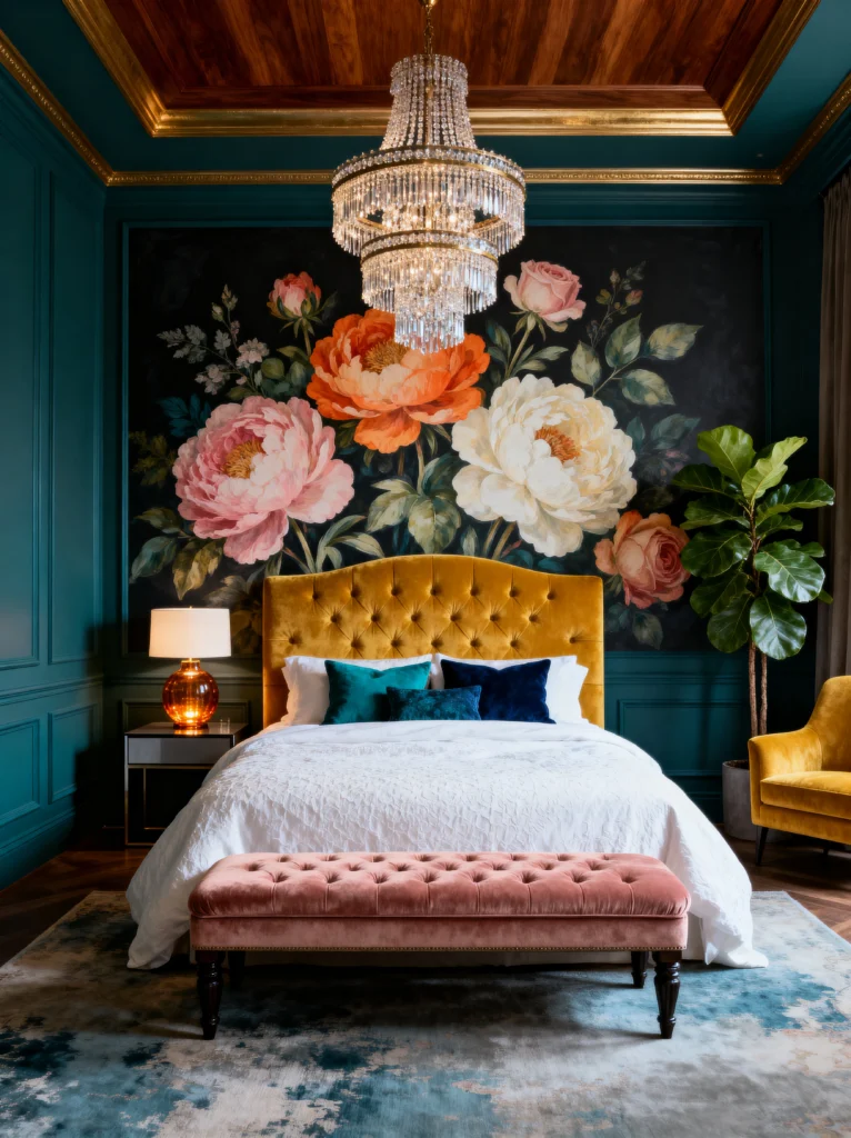 The contrast here is what makes the magic happen. You’ve got these massive, romantic peonies in soft pinks and oranges set against a dark, moody background. It’s “Dark Academia” meets “Grandmillennial” style. And that mustard yellow velvet headboard? It’s a bold choice that pays off. Velvet is such a tactile fabric; it adds a layer of luxury that makes the room feel expensive without being stuffy.