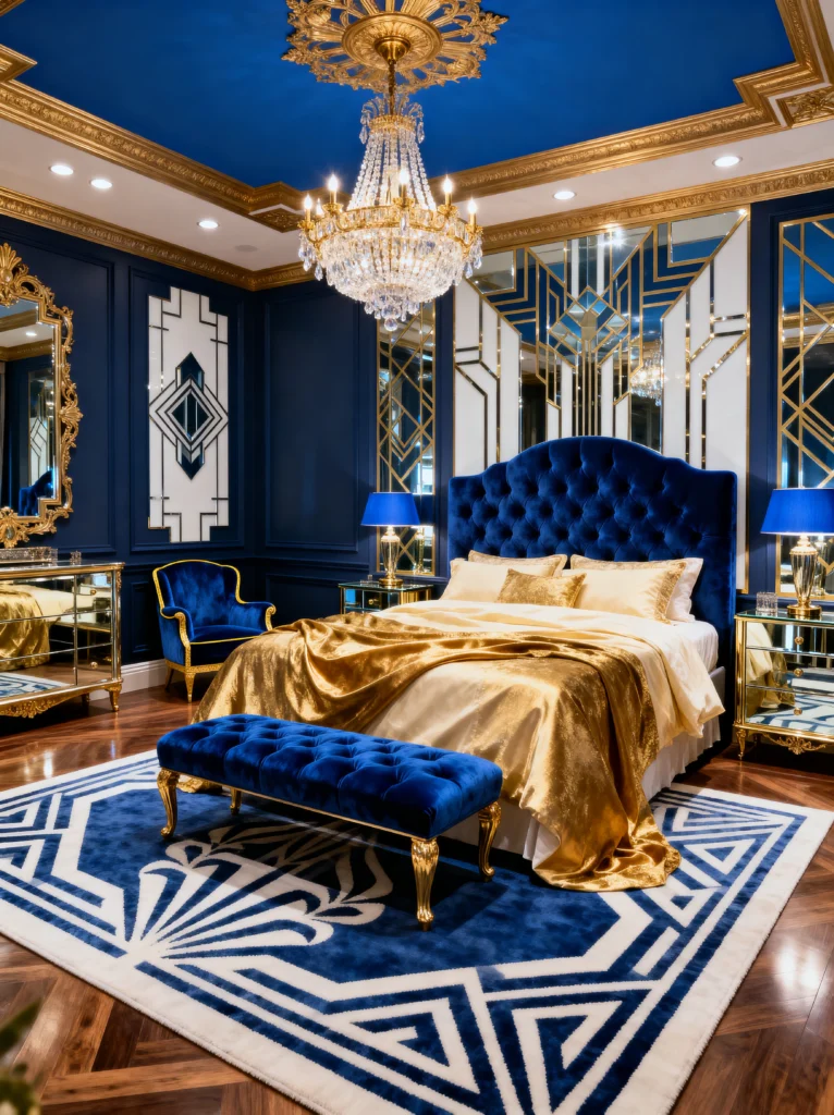 The bed is a mountain of gold silk and blue velvet. The rug is a custom geometric pattern that mirrors the Art Deco mirrors on the wall. It’s symmetrical, it’s grand, and it doesn’t hold back. Looking at this room, you can tell every single piece was chosen to make a statement. It’s bold, blue, and beautiful.