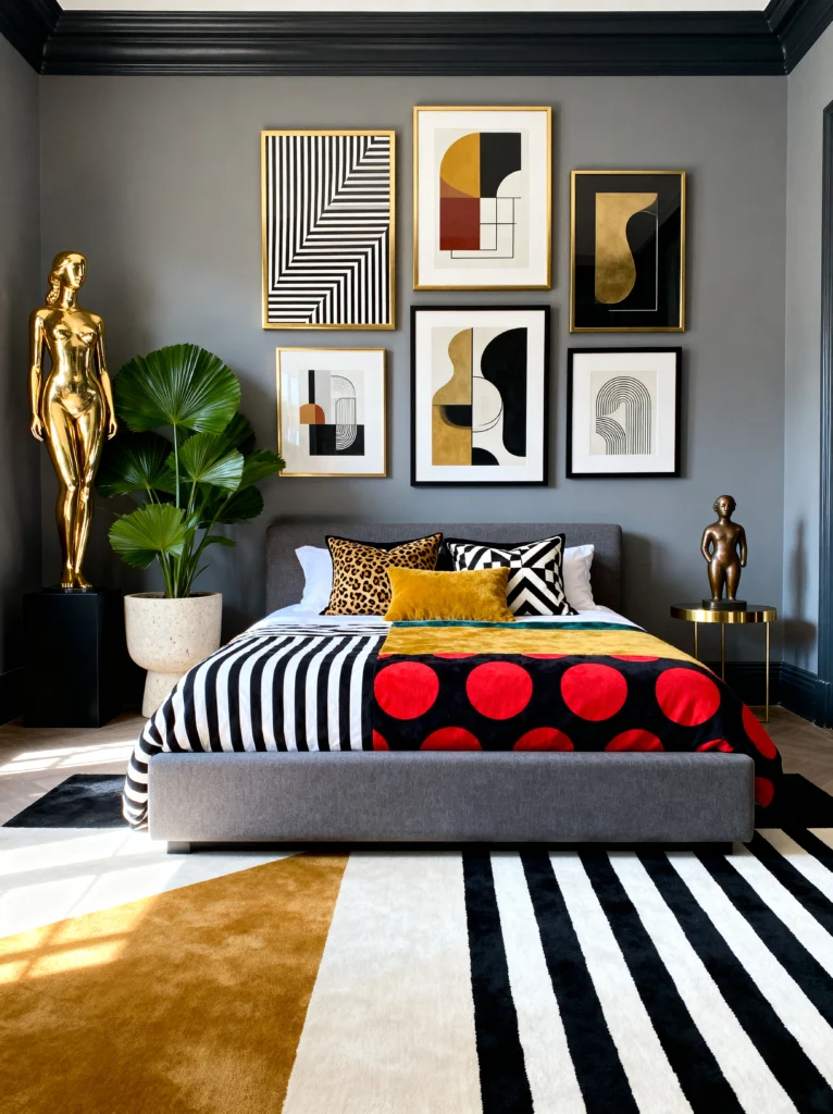 The gallery wall above the bed is perfectly symmetrical in its placement but wildly diverse in its content. It’s all about the black, gold, and ochre palette. By sticking to a strict color story, you can mix a dozen different patterns and they’ll still look like they belong together. And let’s not ignore the gold statue in the corner—it adds a touch of vintage Hollywood glam that keeps the room from feeling too “tech-modern.”