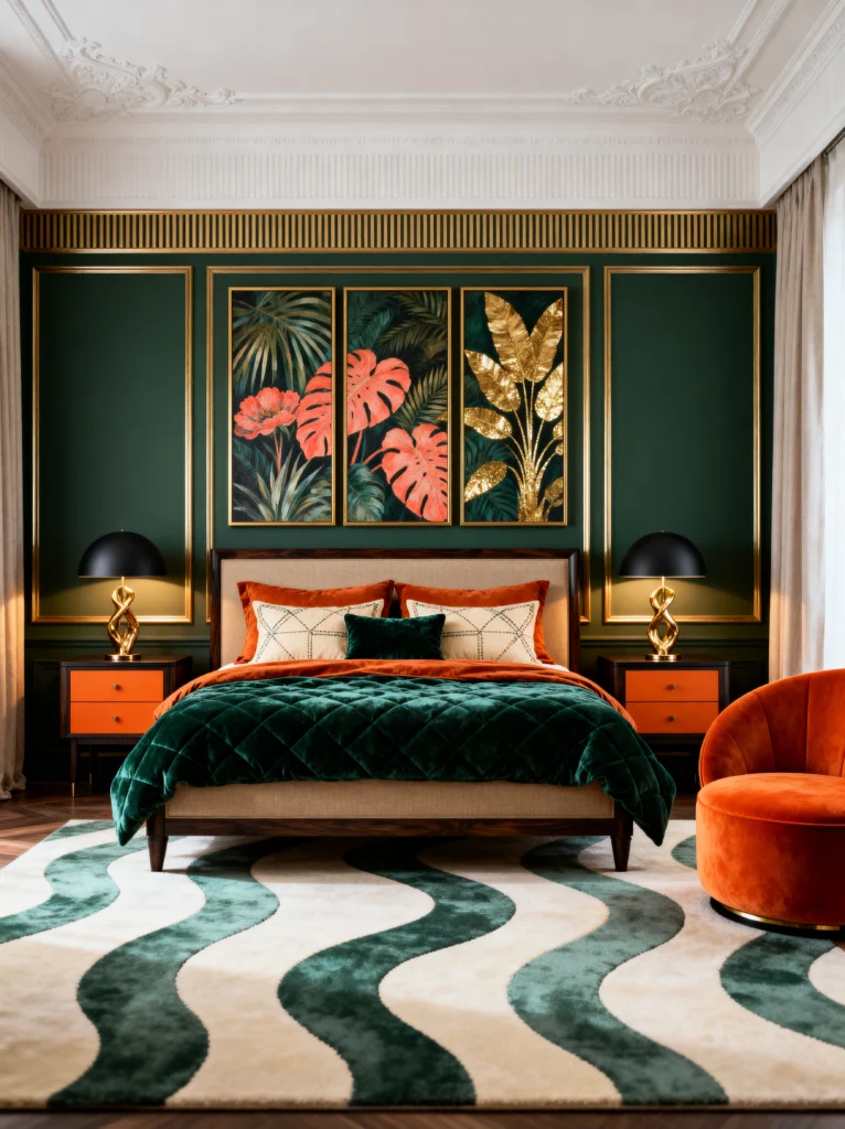 The triptych of tropical leaves above the bed is such a clever way to bring nature indoors without the maintenance of real plants (though real plants are great too!). The orange and burnt sienna accents in the pillows and the velvet chair are the perfect “complementary color” move. On the color wheel, orange and green are opposites, which is why they make each other pop so intensely.