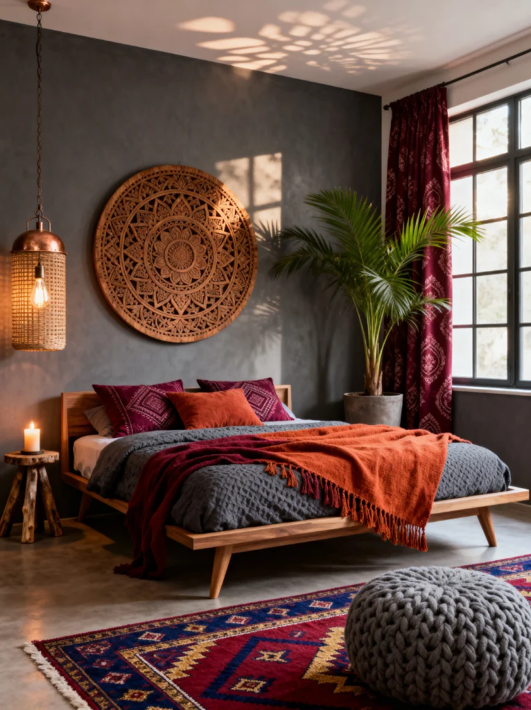 That wooden mandala on the wall is a stunning focal point. It’s intricate and soulful, and it perfectly complements the mid-century modern bed frame. The color palette of deep plum, burnt orange, and charcoal gray is incredibly sophisticated. It’s “earthy” but elevated.