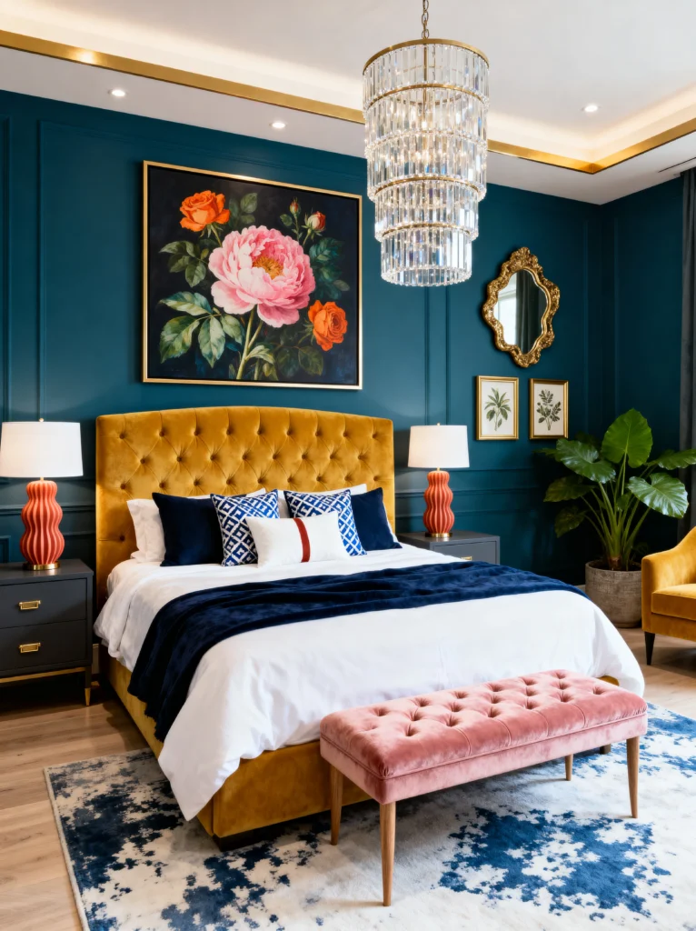 I also love the mix of patterns on the pillows. You have a classic Greek key-style blue and white print mixed with solid velvets. It’s a great way to show that you don’t have to be a “minimalist” to have a room that feels organized and clean. The pink velvet bench at the end of the bed is the “cherry on top,” adding a soft, feminine touch to a room full of bold colors.