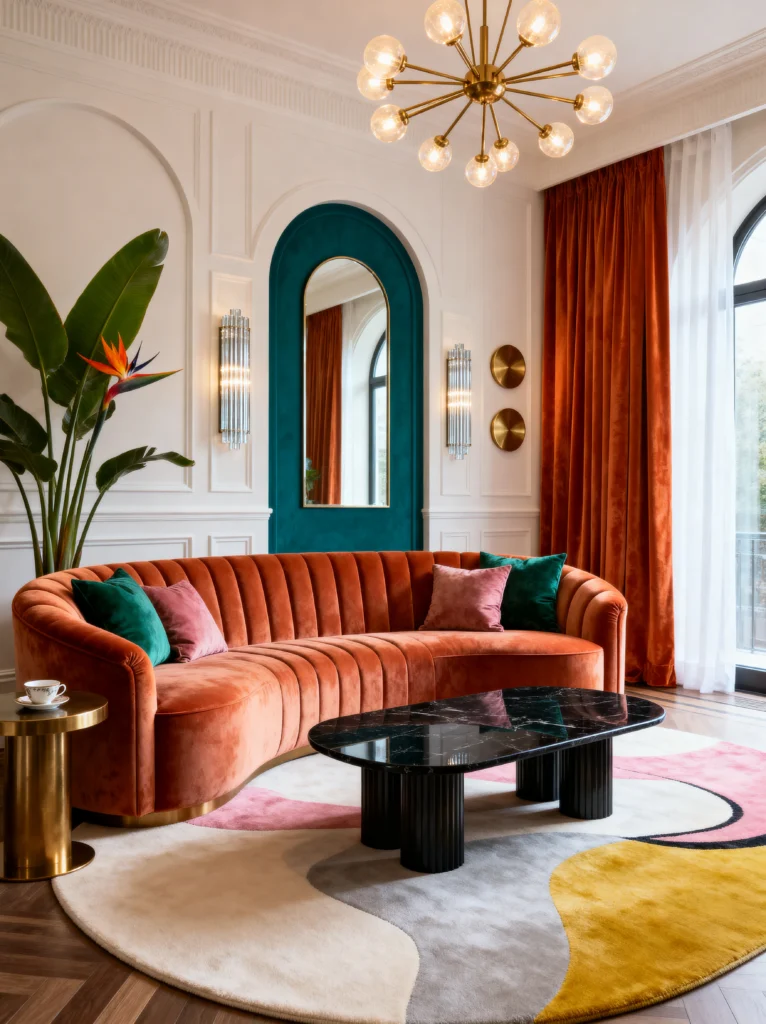 But what really makes this work is the contrast. You’ve got that deep teal arched accent on the wall that makes the orange pop, and then that marble coffee table to ground everything with a bit of weight. And that rug! It’s basically art for your floor. It ties in the pinks, yellows, and greys without feeling like it’s trying too hard. If you want to recreate this, don’t be afraid to mix “warm” colors like orange with “cool” colors like teal. It creates a visual tension that keeps the eye moving. Also, notice the gold accents? They add just enough shine to make it feel expensive without being gaudy. This is a Masterclass in balancing “trendy” with “timeless.”