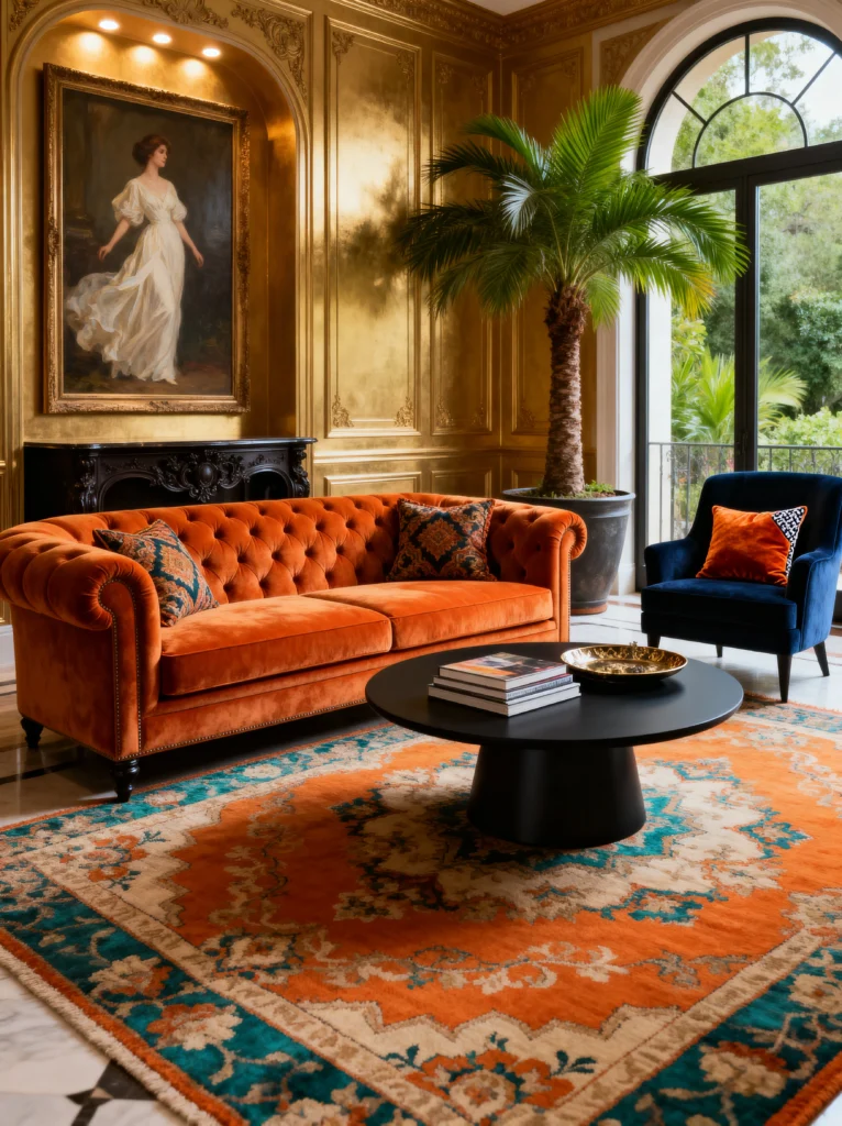 The rust-orange Chesterfield sofa is the perfect choice to anchor the room—it’s a classic shape but in a color that feels fresh and vibrant. The dark navy armchair provides a cool contrast that makes the orange pop even more. And the rug! It’s a traditional Oriental style but with amplified colors that match the room’s energy. To get this look, think about “rich” textures: velvet, leather, gold leaf, and dark wood. It’s about creating a space that feels like it has a history, even if you just put it together yesterday.