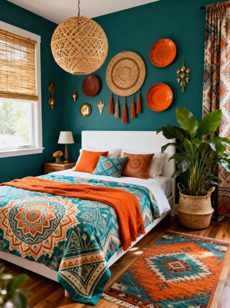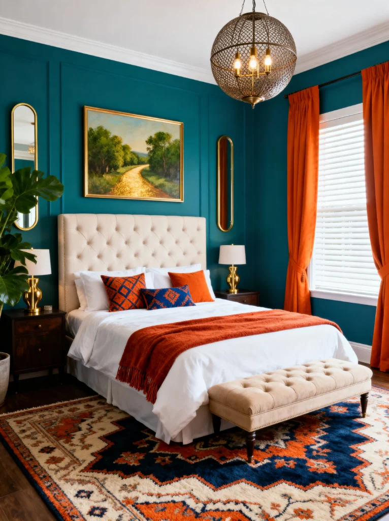 Notice how the headboard is a neutral cream? That’s the secret sauce here. It gives your eyes a place to rest amidst all that high-contrast color. The rug ties the whole “teal meets orange” theme together with a classic pattern that feels timeless. It’s like the room is giving you a warm, stylish hug. If you’re nervous about color, start with one deep wall tone and pick a secondary “pop” color for your linens and drapes—it’s a foolproof way to look like a pro.