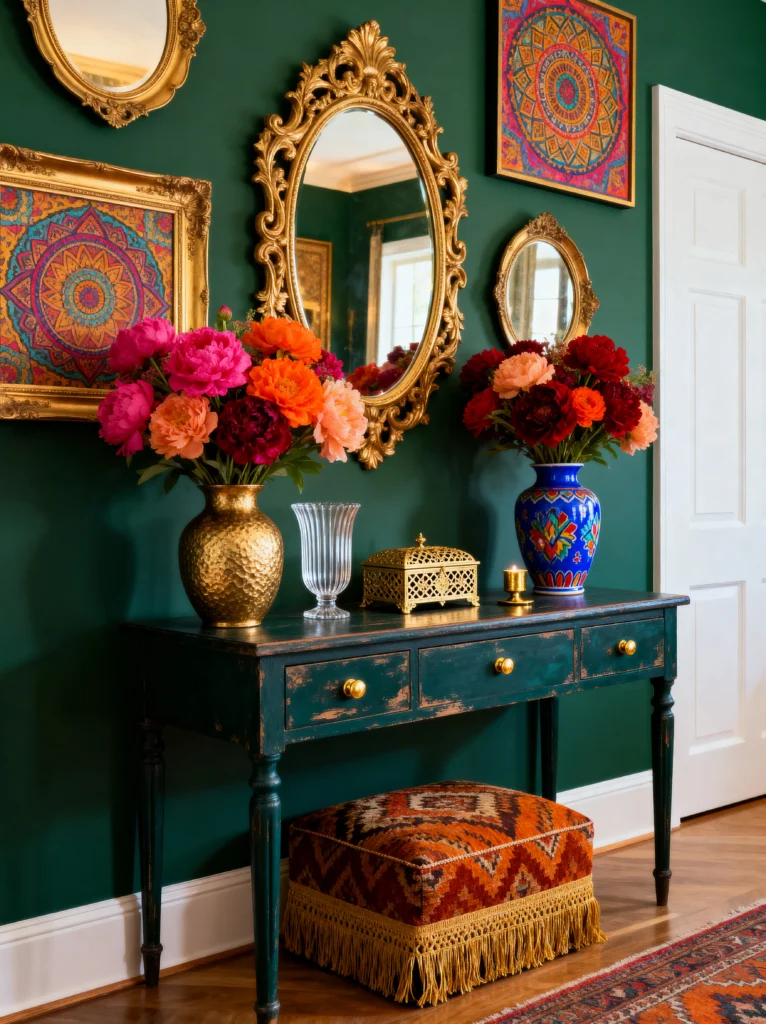 The console table has that perfect distressed, lived-in look, but then you have these explosive, vibrant peonies in gold and blue vases that bring in a sense of luxury. The real star, though, is that fringed ottoman tucked underneath. It’s such a clever use of space! If you have a narrow hallway, don’t be afraid to go dark with the paint—it actually makes the walls feel like they’re receding, which can make the space feel bigger and way more expensive.