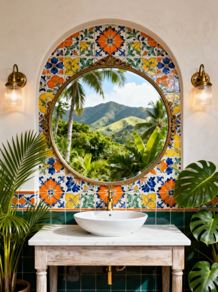Okay, let’s go to the bathroom, but let’s make it feel like a five-star resort in the Mediterranean. This sink area is absolute goals. Those hand-painted tiles are the ultimate “wow” factor. They’re busy, yes, but because the rest of the walls are a clean, textured white, it doesn’t feel overwhelming.