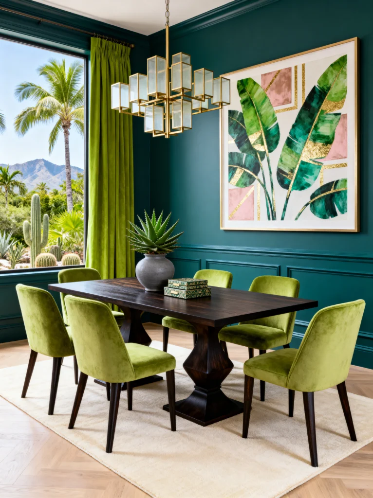 Moving into the dining area, we’re seeing a shift toward “Tropical Glam.” This is where you host the dinner parties that people talk about for years. Those lime green velvet chairs against the dark teal walls? Iconic. It’s a color combo that shouldn’t work on paper, but in person, it is electric.