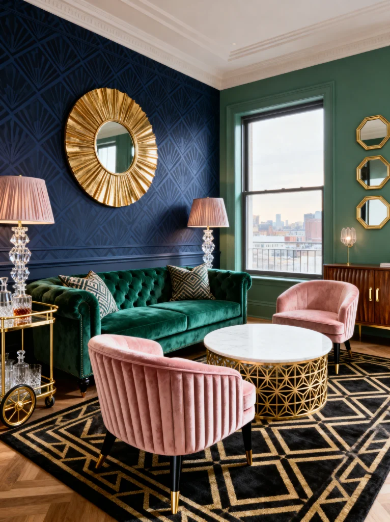 Now, this living room is for the person who loves a bit of vintage flair. We’ve traded the teal for a deep, midnight blue wallpaper with a subtle Art Deco fan pattern. It’s incredibly chic. The emerald green tufted sofa is a classic piece, but pairing it with those dusty rose velvet chairs? That is a total power move.