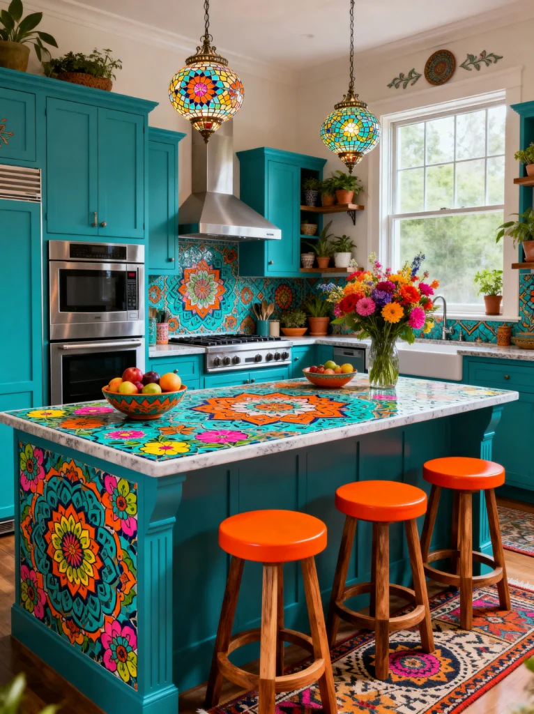 Who says kitchens have to be white and boring? This space is a literal explosion of joy. The turquoise cabinets are a bold choice, but when you pair them with those incredible mosaic countertops and that mandala-patterned island, it becomes a work of art.