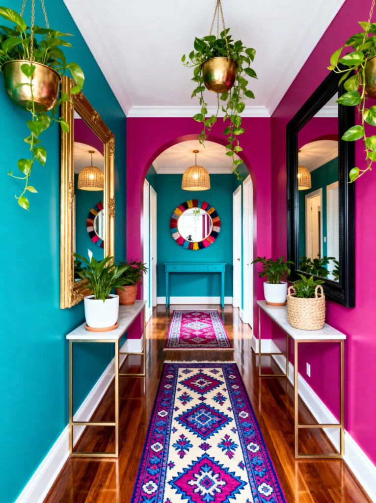 The symmetry here is what keeps it from looking chaotic. You’ve got the matching console tables and mirrors on either side, which creates a sense of order. The long geometric runners lead your eye right through the space. It’s a great reminder that a hallway isn’t just a way to get from point A to point B—it’s an opportunity to show off your style.