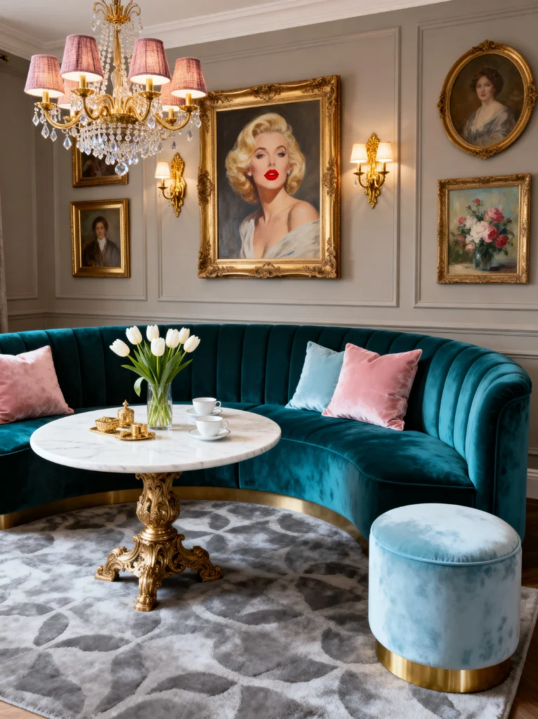 The grey patterned rug and the marble-topped table keep things grounded. This feels like the perfect spot for a morning tea or a late-night chat. The key to making a small nook feel grand is to use oversized elements—a large chandelier, big art, and a plush rug. It makes the space feel intentional rather than like an afterthought.