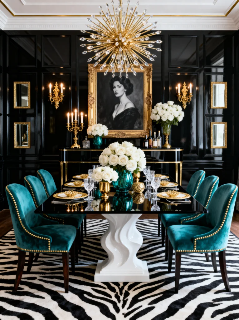 The teal velvet chairs are the perfect “pop” here. Teal and gold is a color combination that never fails, especially when set against a monochrome background. The zebra-print rug is a daring choice, but because the rest of the room is so structured, it adds a much-needed organic, wild element. To pull this off at home, keep your florals simple. Those white roses in the teal vases bring a softness to the sharp edges of the black table and the gold chandelier. Lighting is everything in a dark room—you need those sconces and that massive “starburst” chandelier to make sure the “moody” doesn’t turn into “gloomy.”