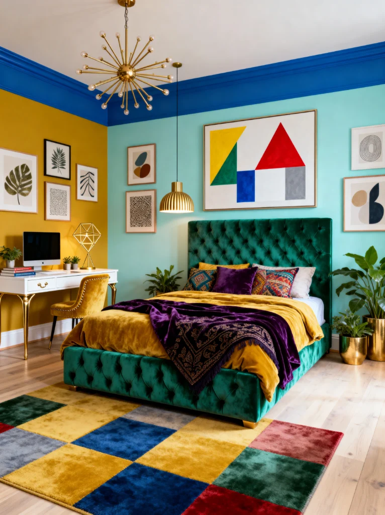 Finally, we have the ultimate maximalist bedroom. This room is a masterclass in color blocking. You’ve got yellow, teal, blue, and purple all living together in harmony. The emerald green tufted bed is the centerpiece, but that multi-colored checkered rug is what really ties the room’s palette together.