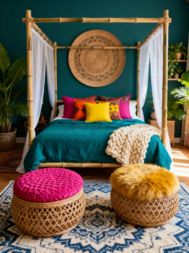 The wall color is a deep, saturated forest green—it’s like sleeping inside a jungle canopy. To keep it from feeling too heavy, there’s a massive woven wall hanging and those bright, punchy pillows in magenta, orange, and yellow. It’s all about layers here: the chunky knit throw, the patterned rug, and the woven ottomans. My favorite part? The plants. You can never have too many plants in a room like this. They literally breathe life into the design. If you want this look, focus on natural materials—bamboo, jute, wool, and cotton. It’s less about everything matching and more about everything feeling right together.