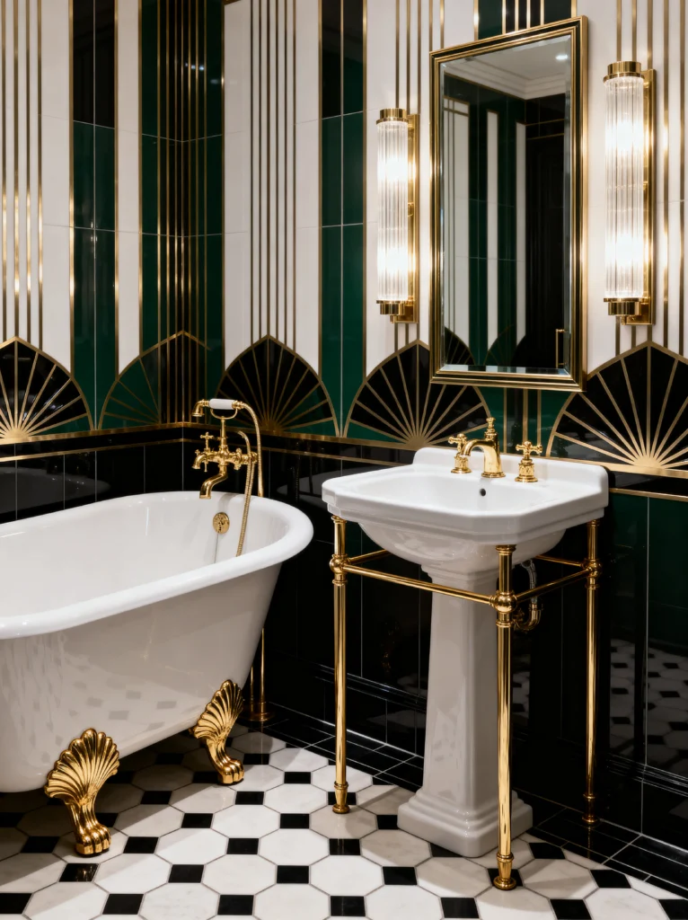 Okay, can we talk about this bathroom? It is straight out of the Great Gatsby’s mansion. Art Deco is all about geometry and luxury, and this space nails both. Those green and gold fan patterns on the wall are iconic. It’s bold, it’s graphic, and it turns a functional space into a literal art gallery.