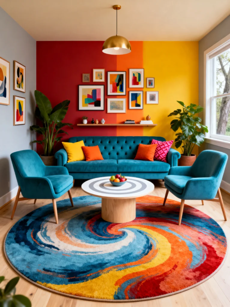 If you aren’t afraid of a little (or a lot) of color, this room is for you. This is “Modern Maximalism” at its finest. The tri-color accent wall—red, orange, and yellow—is such a brave choice, and it pays off because the furniture is equally vibrant. That peacock blue sofa is a total showstopper.