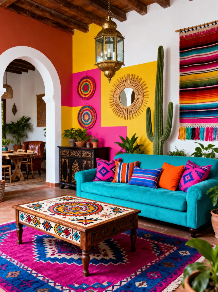 This space feels like a beautiful mix of a Mexican villa and a Moroccan riad. The architecture alone—with that stunning white archway and the exposed wood ceiling—is incredible. But the decor is what brings the soul. That bright turquoise sofa against the pink and yellow color-blocked wall is such an unexpected and joyful combination.