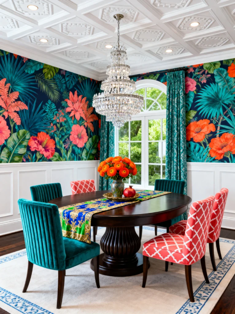 The mix of chairs is a pro move—velvet teal chairs on the sides and coral lattice-patterned chairs at the ends. It adds variety and keeps the look from feeling like a showroom set. The crystal chandelier adds that touch of “chic” to the “tropical,” making it feel like a high-end resort. Pro tip: if you’re using a busy wallpaper, keep your table setting simple or use a runner that pulls out one of the accent colors, like the bright blue and green one here. It’s all about finding that one common thread to stitch the look together.