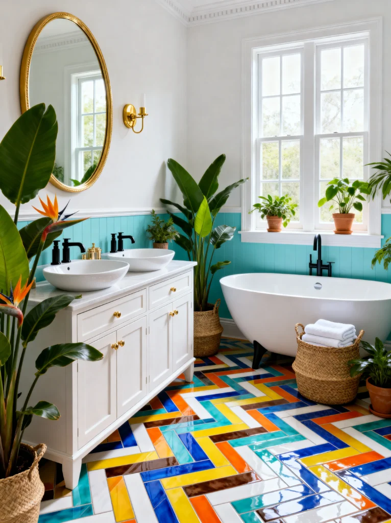 This bathroom is a masterclass in using floor tiles to make a statement. That colorful herringbone pattern is absolutely wild, but because the walls are kept mostly white and soft aqua, it works. It turns the floor into the “main event.”