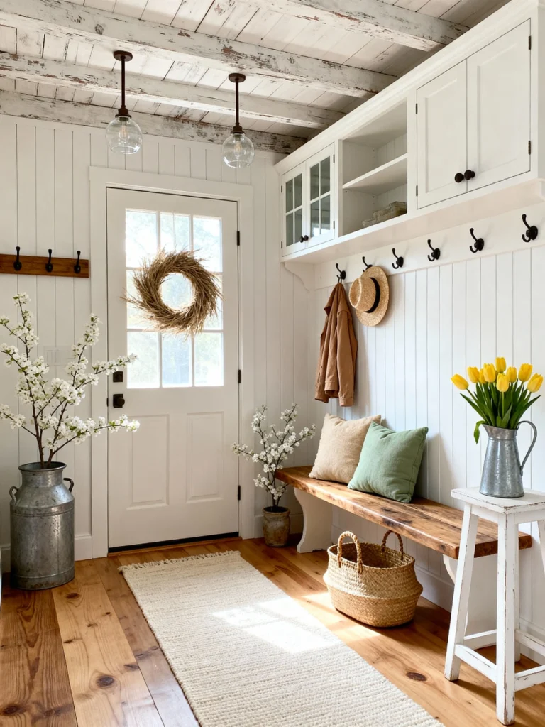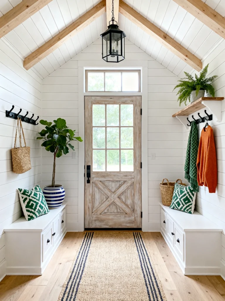 Finally, we have the quintessential “Coastal Farmhouse” entry. White shiplap walls are a classic for a reason—they make everything feel clean and bright. I love the symmetry of the built-in benches on either side of the door. It’s the perfect “drop zone” for a busy family.
