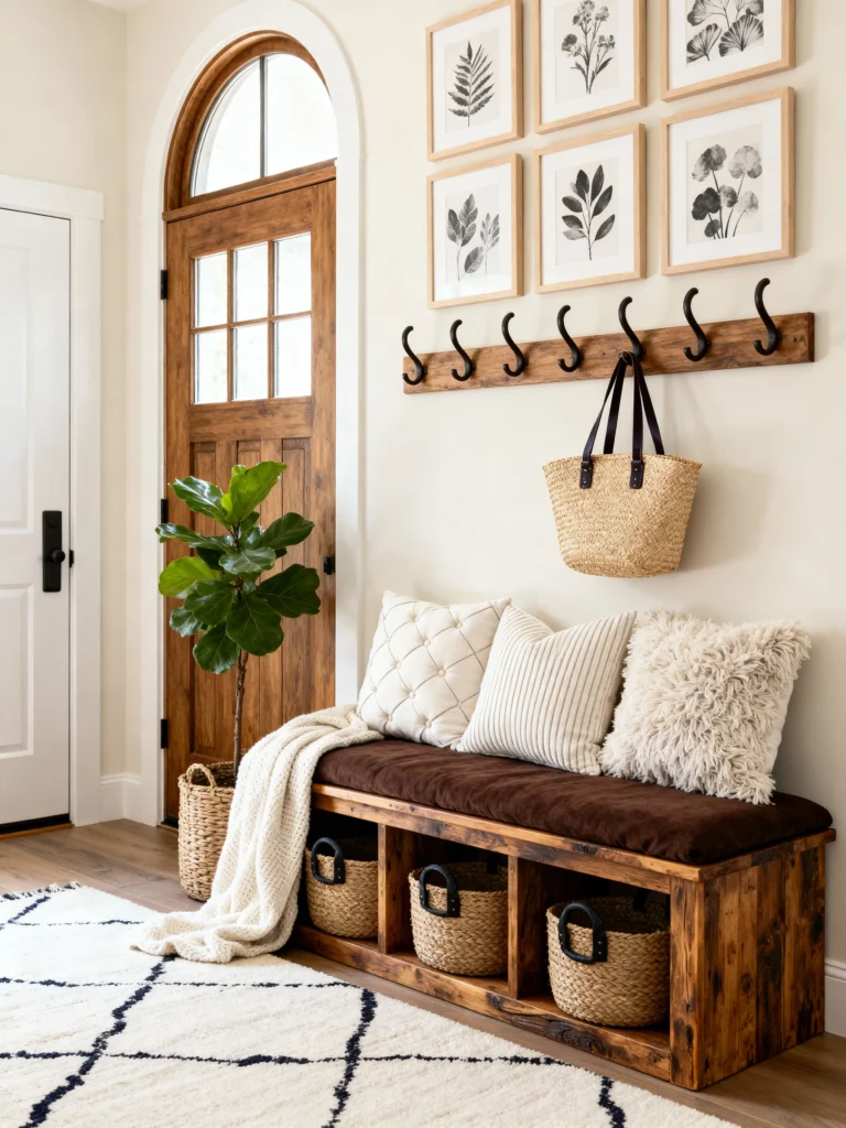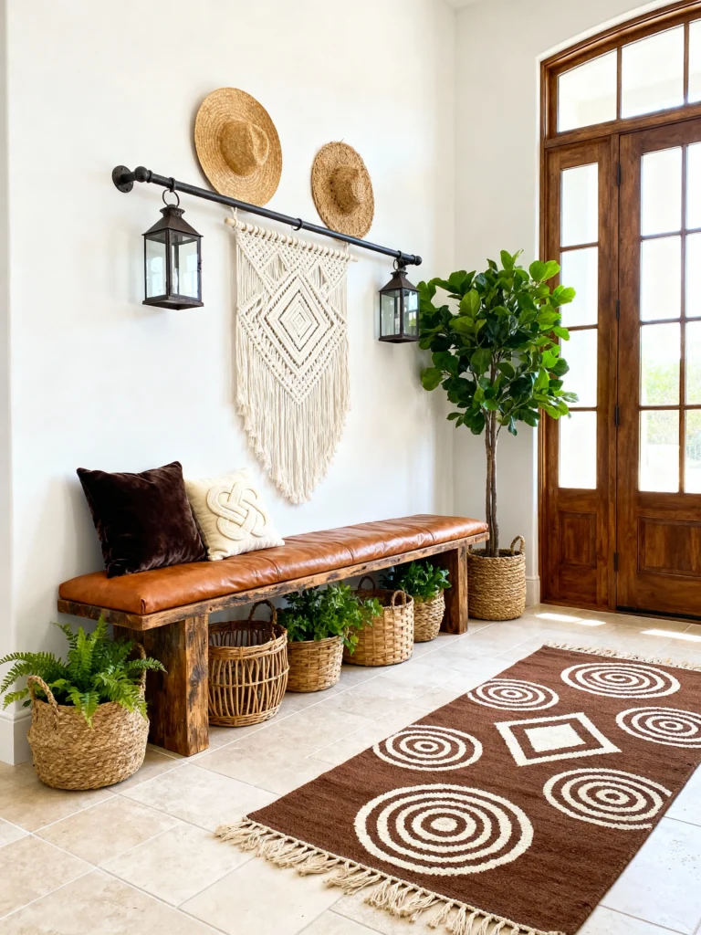 Speaking of the floor, look at that bench! It’s a thick, reclaimed wood slab topped with a cognac leather cushion. It looks expensive but feels lived-in. And can we discuss the baskets? Placing various woven baskets under the bench is a lifesaver for hiding shoes and “junk” while keeping that earthy aesthetic. The fiddle leaf fig in the corner adds just enough height to balance the doorway. It’s a masterclass in using natural materials like jute, leather, and wood to create a space that feels high-end yet totally approachable.