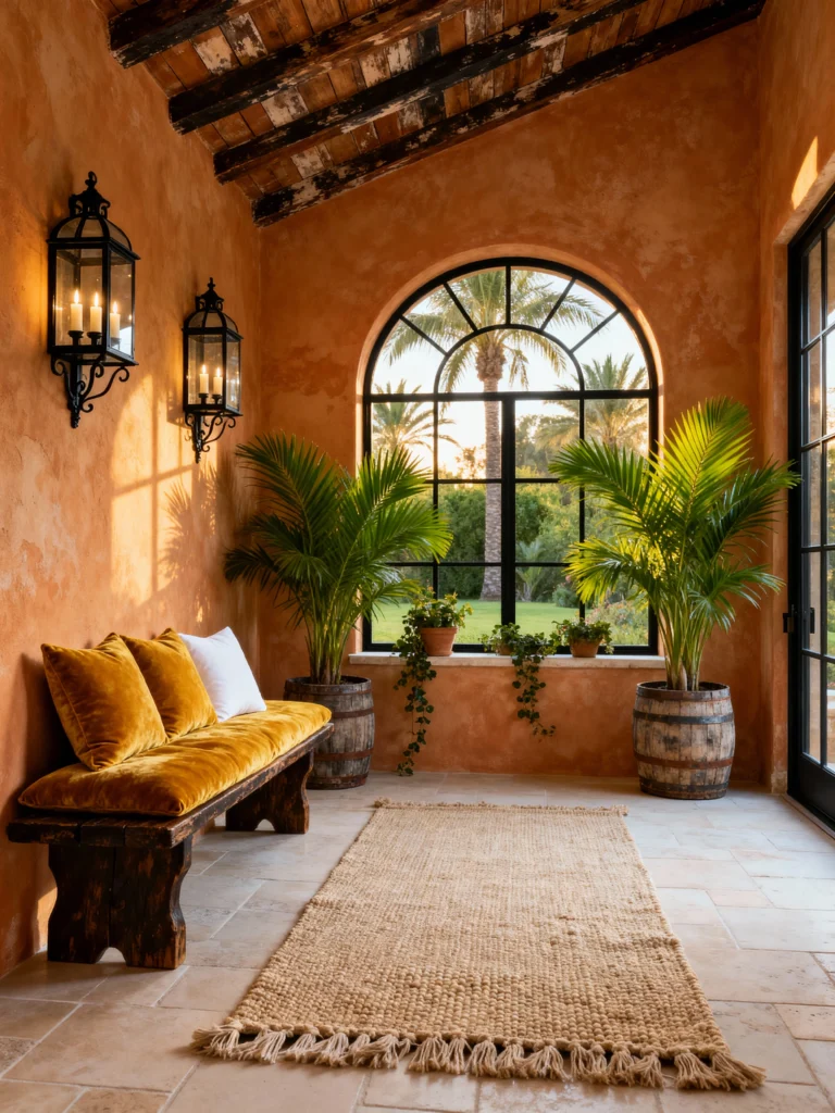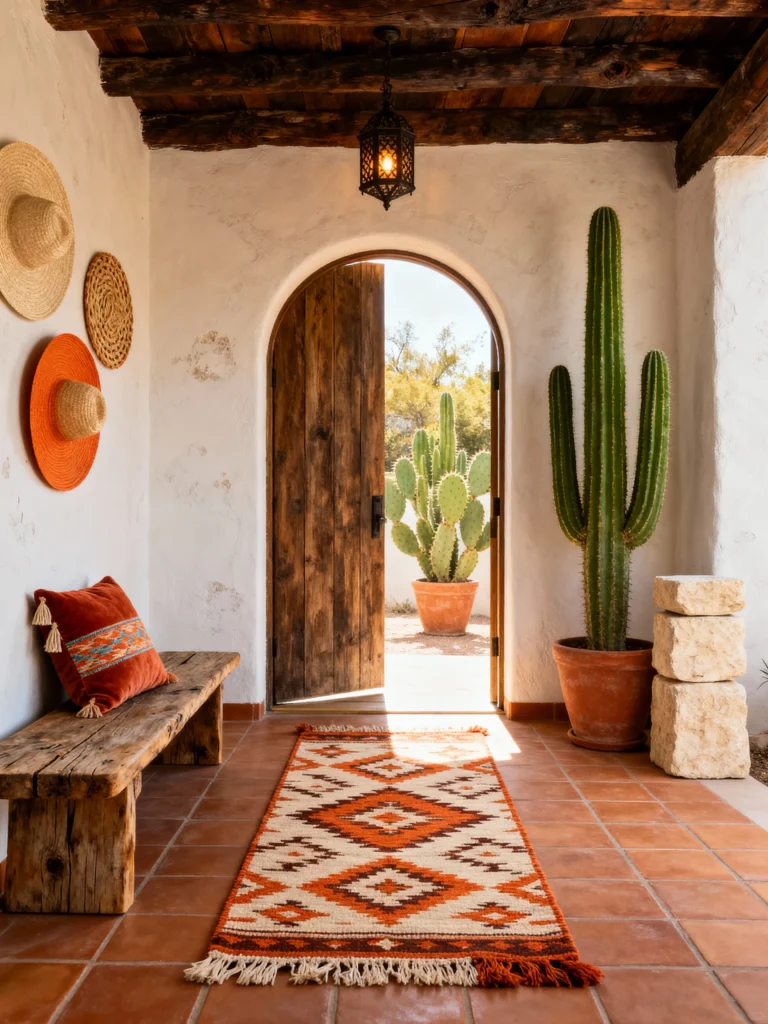 This one feels like a getaway to Santa Fe. The arched doorway is the absolute star here—it frames the outdoor cacti like a living piece of art. If you have an entryway that leads directly outside, this is how you blur the lines. The terra cotta tile floors give off such a classic, Mediterranean warmth that’s impossible to replicate with laminate.