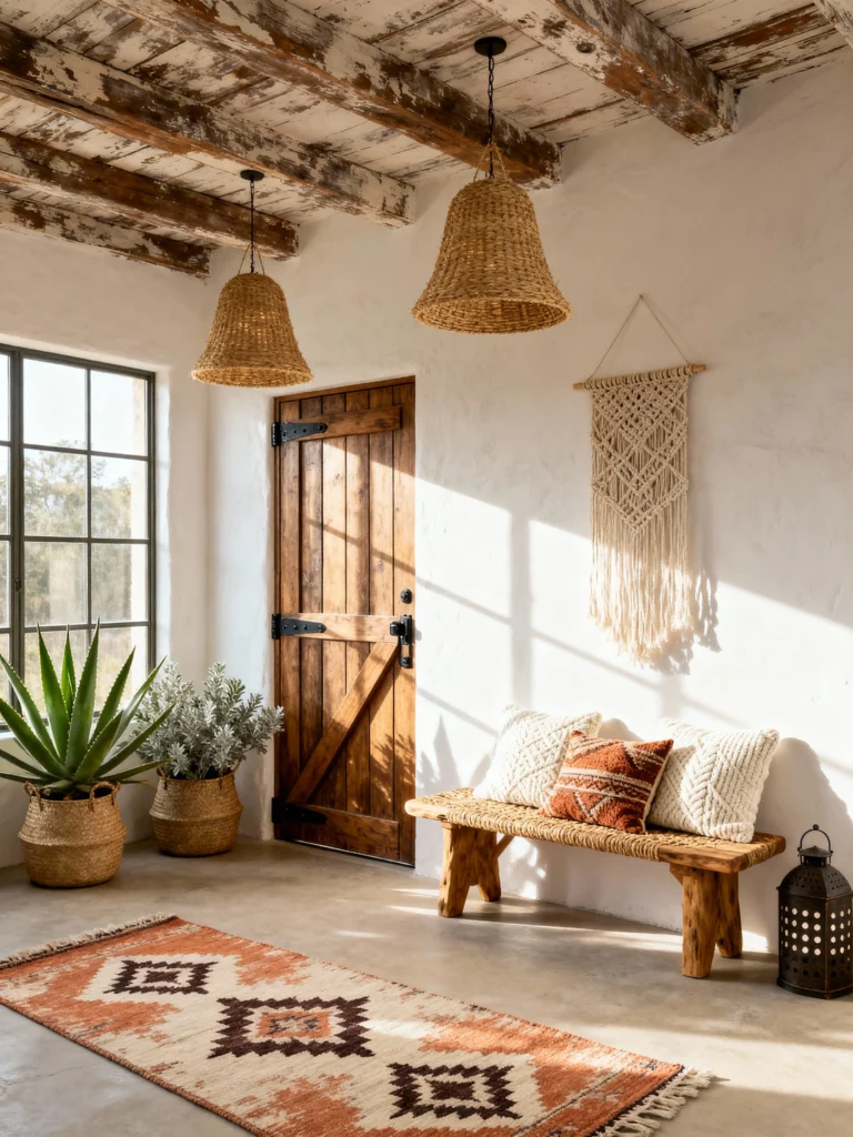 The pops of green from the plants and the patterned pillows give it a fresh, summery vibe. The “X” detail on the wooden door adds that rustic charm that ties back to the ceiling beams. It’s a very practical space—hooks for bags, drawers under the benches for shoes, and a sturdy jute runner for high traffic. It’s proof that a space can be incredibly organized and “work-hard” while still looking absolutely beautiful.