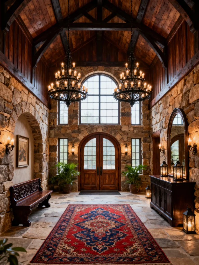 Wow. Just… wow. This is for the person who wants their home to feel like a modern-day castle. The floor-to-ceiling stonework is incredible. It’s heavy, it’s permanent, and it’s undeniably grand. The double arched doors and that massive window above let in a ton of light, which is crucial because all that stone and dark wood could feel heavy otherwise.