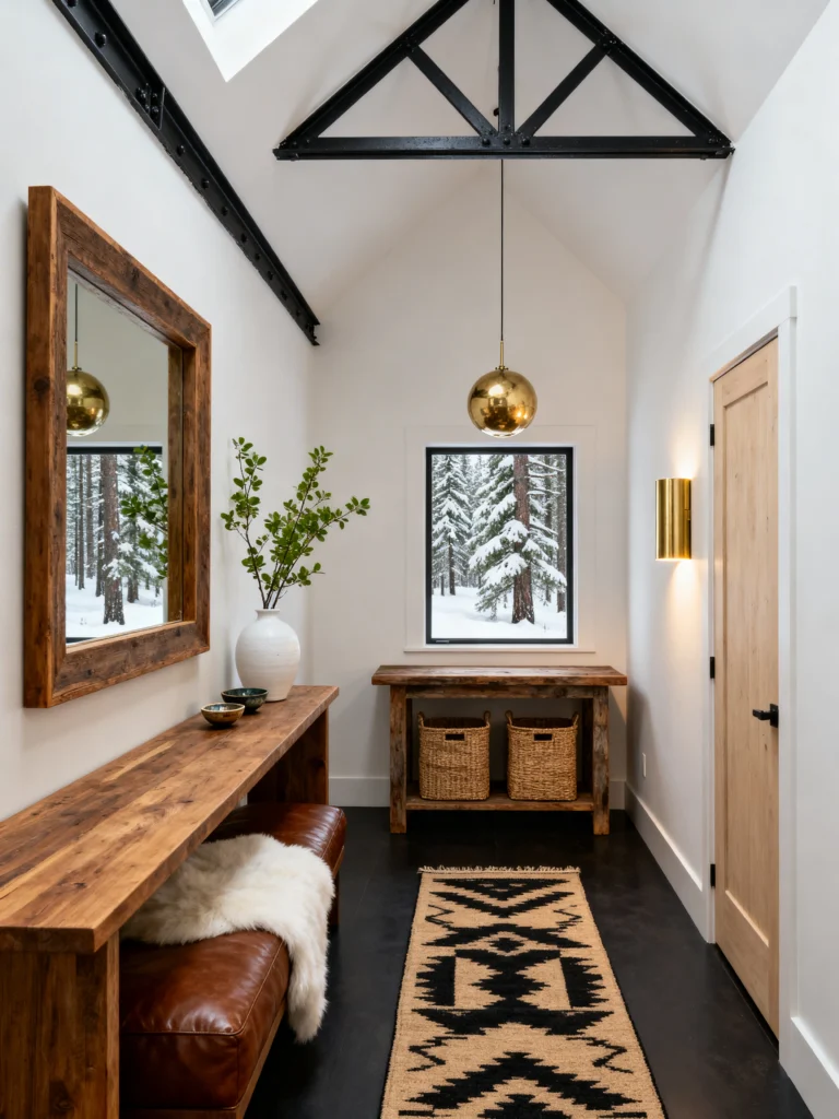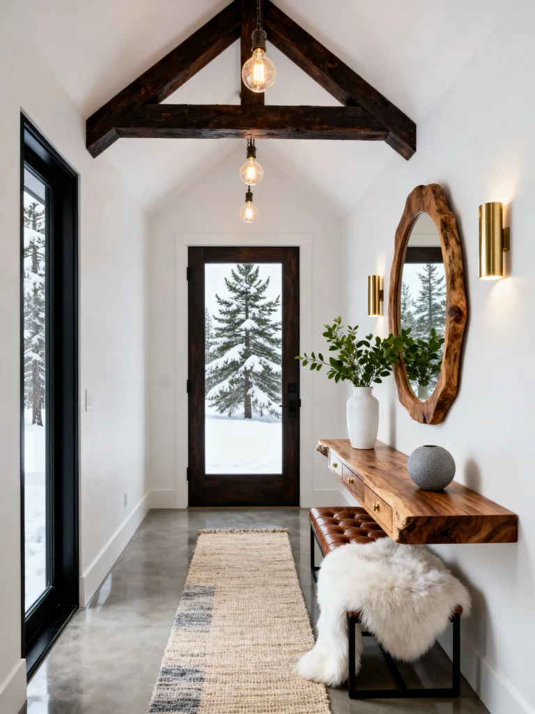 This is the ultimate “Winter Wonderland” entryway. The view through that glass door is spectacular, but the interior holds its own. It’s a very narrow space, so they’ve played with “floating” elements to keep it feeling open. That live-edge floating console table is a genius move—it gives you a place for your keys and a vase without taking up any floor real estate.