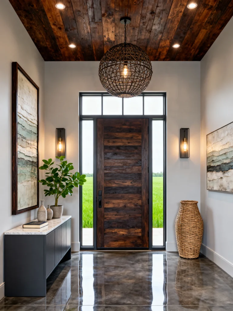 This entry is all about sophisticated textures. The wood-slat ceiling creates a very high-end, custom feel immediately. But the real star is that oversized, woven orb pendant light. It’s like a piece of art hanging in the middle of the room. It breaks up the straight lines of the door and the console table.