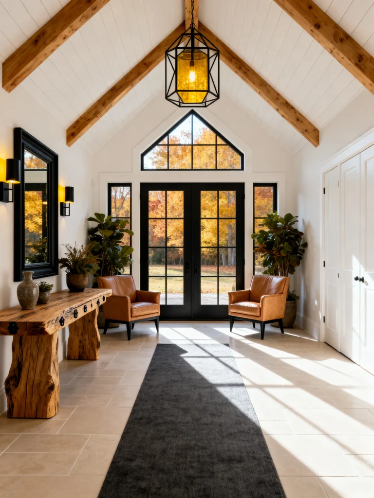 If light is what you crave, this is your dream entryway. The massive black-framed windows and doors let the outdoors in, making the foyer feel ten times larger than it actually is. The vaulted ceiling with the simple wood beams keeps it feeling “Farmhouse,” but the furniture is much more “Modern.”
