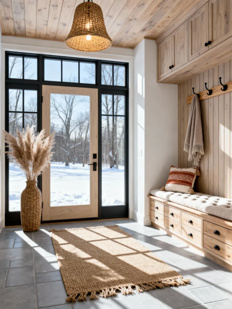 This entryway is a masterclass in “Scandi-cool.” Looking out that glass door at the snow makes me want to wrap myself in that throw blanket immediately! The vibe here is all about light, natural wood—it’s clean, airy, and super functional.