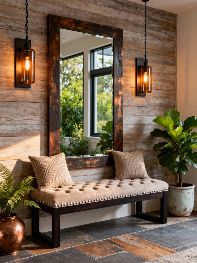Okay, can we talk about the mood here? This feels like the entrance to a very cool, hidden boutique hotel. The wood-paneled wall has this distressed, almost “driftwood” finish that provides the perfect backdrop for those stunning amber glass sconces. Lighting is everything in an entry, and these give off such a warm, inviting glow.