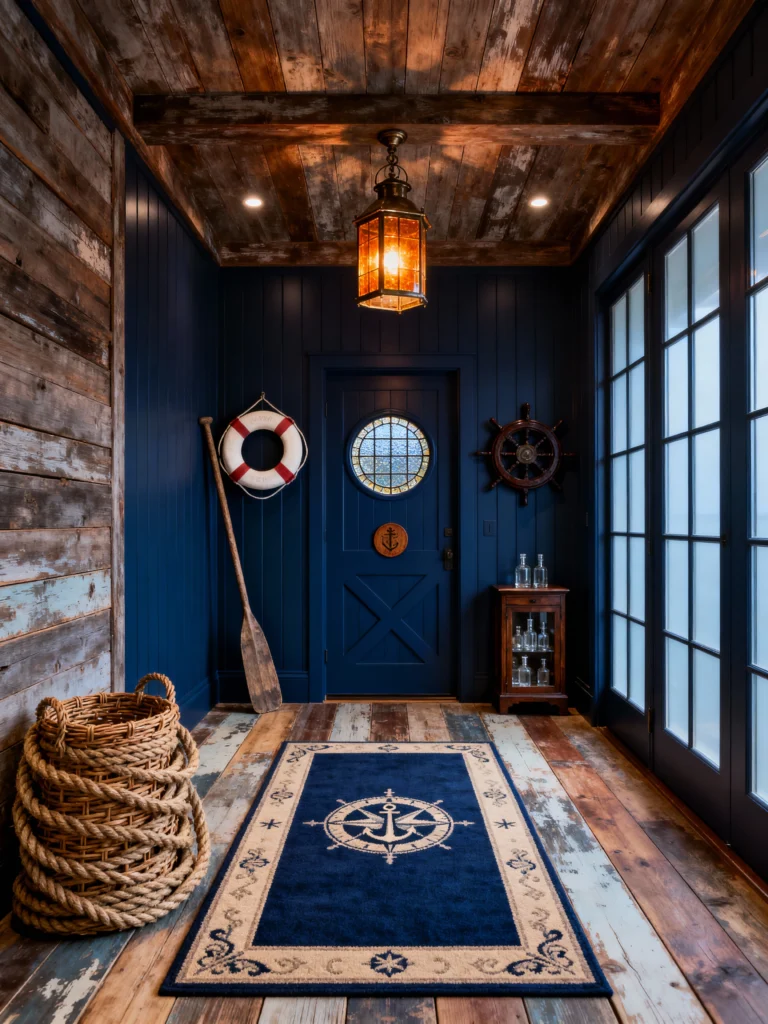 Notice the details: the life ring, the wooden oar leaning in the corner, and that compass-design rug. Even the light fixture looks like a vintage lantern. It’s a great lesson in choosing a theme and really leaning into it. It’s not just a hallway; it’s a vibe.