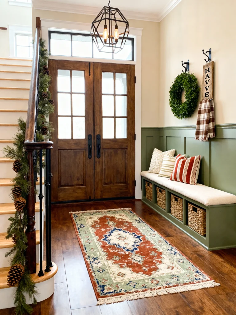 The double wooden doors are grand and welcoming, and I love how the staircase is decorated with a pine garland. It shows that your entryway can change with the seasons. The rug is the secret hero here—it’s got a vintage, faded pattern with pops of terracotta and blue that tie the green walls and the dark wood floors together perfectly.