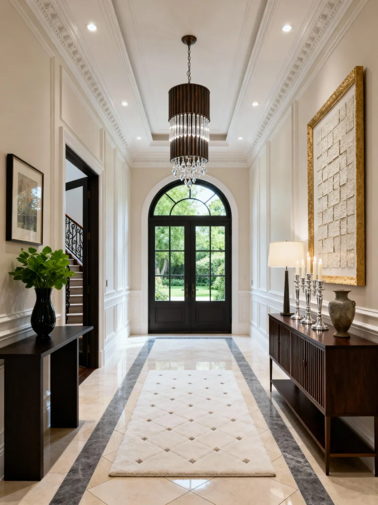 The styling on the sideboard is very “curated”—tall candles, a sculptural vase, and a large piece of textured art. This isn’t a “drop your keys” kind of place; it’s a “welcome to the gala” kind of place. If you have a long, narrow hallway, a slim console table like the one on the left is your best friend for adding style without blocking the path.
