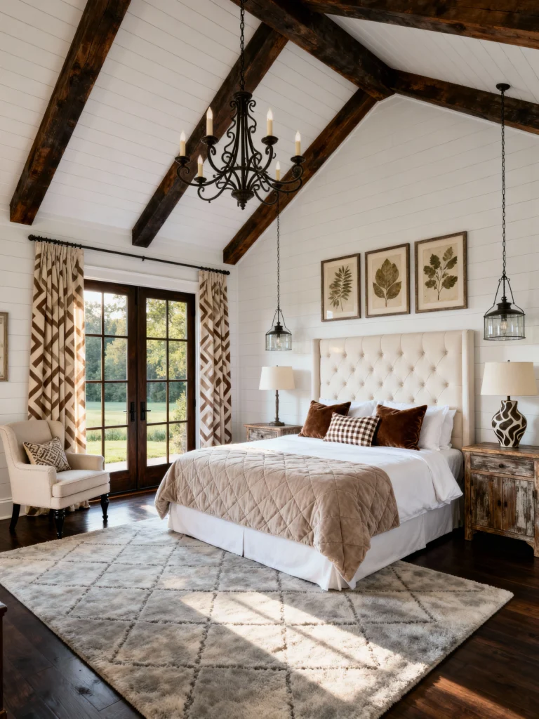Have you ever walked into a room and felt like you could finally just breathe? That is exactly the vibe of this first bedroom. It is the ultimate masterclass in what I like to call “Acreage Chic.” The first thing that hits you is that incredible vaulted ceiling. Those dark wood beams provide such a grounding contrast against the crisp white shiplap—it’s like the architectural version of a warm hug.