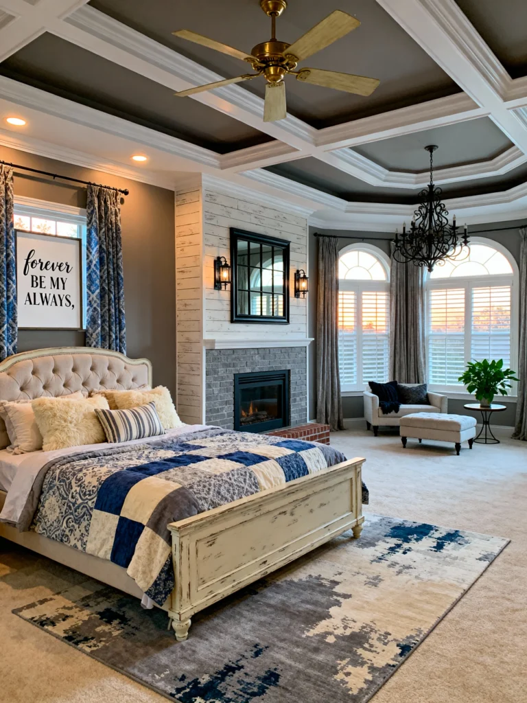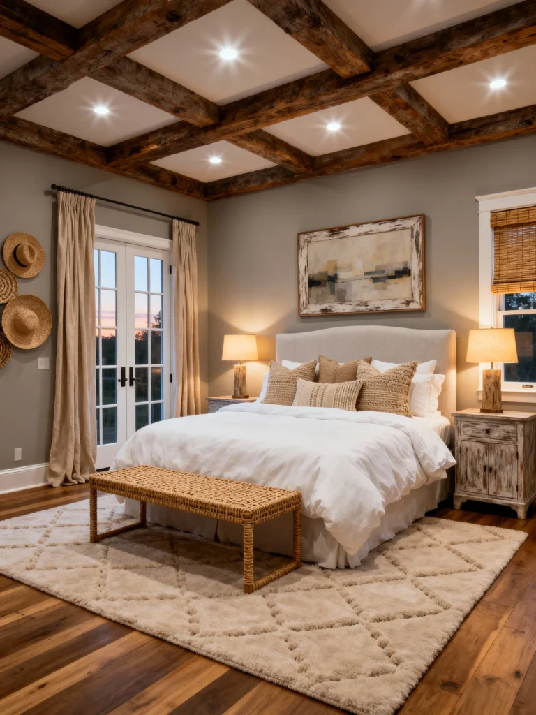 We have a room that feels very “Coastal Rustic.” The coffered ceiling with the wood beam inserts is a unique way to add character to a standard rectangular room. It makes the ceiling feel like a piece of furniture itself. The muted grey walls are a great backdrop for the warm wood tones and the crisp white linens.