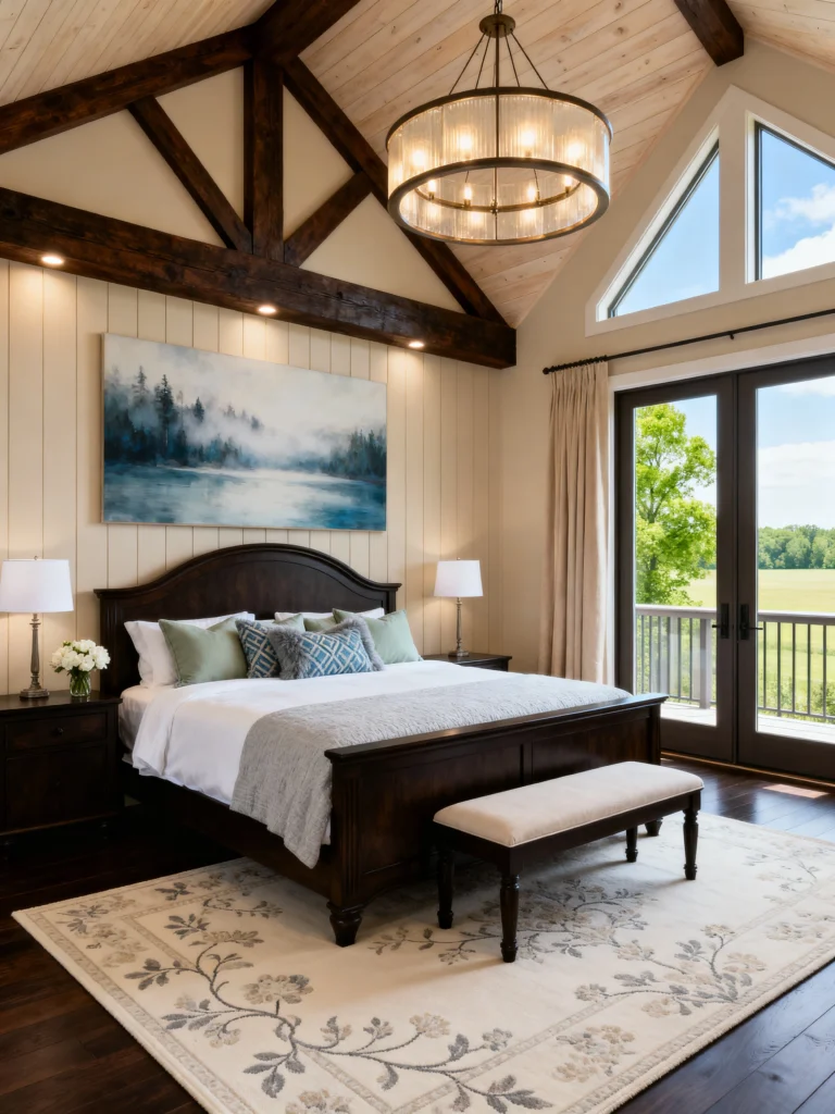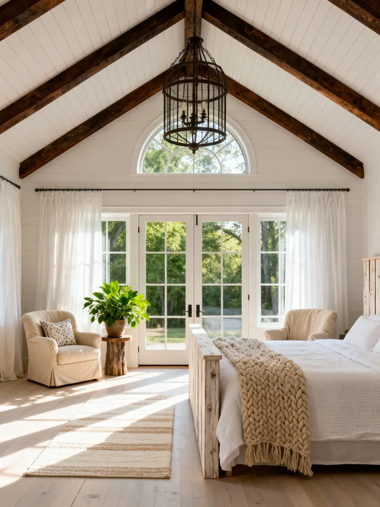 What really makes this room work is the natural light. Those French doors aren’t just doors; they’re a living painting of the woods outside. Imagine waking up, swinging those open, and smelling the fresh grass while you’re still tucked under that chunky knit throw. And can we talk about that lighting fixture? It’s a massive birdcage chandelier that adds a bit of “old world” weight to an otherwise very light room. It’s the kind of space where you don’t just sleep; you rejuvenate.