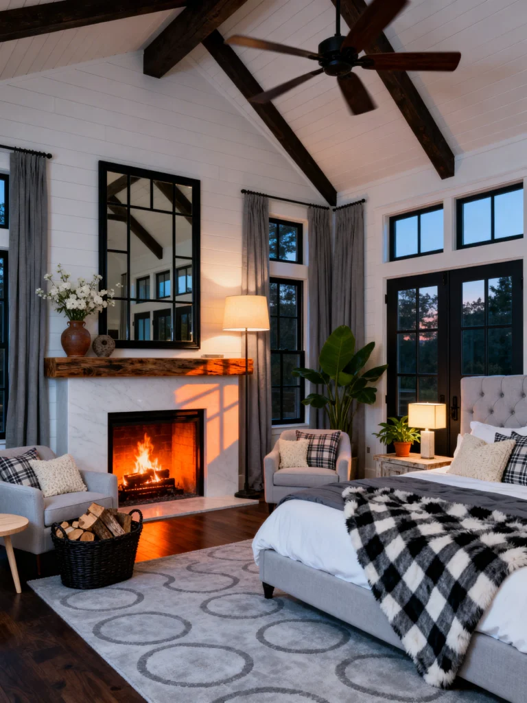 The star of the show is clearly that fireplace. Having a full-sized hearth in the bedroom is the ultimate flex, isn’t it? The oversized mirror above the mantel is a great trick—it reflects the light from the fire and makes the room feel twice as large. I also love the mix of patterns here; you’ve got the buffalo check throw on the bed playing against a more organic, circular pattern on the rug. It shouldn’t work, but because the colors stay in that grey/white/black family, it looks effortless.