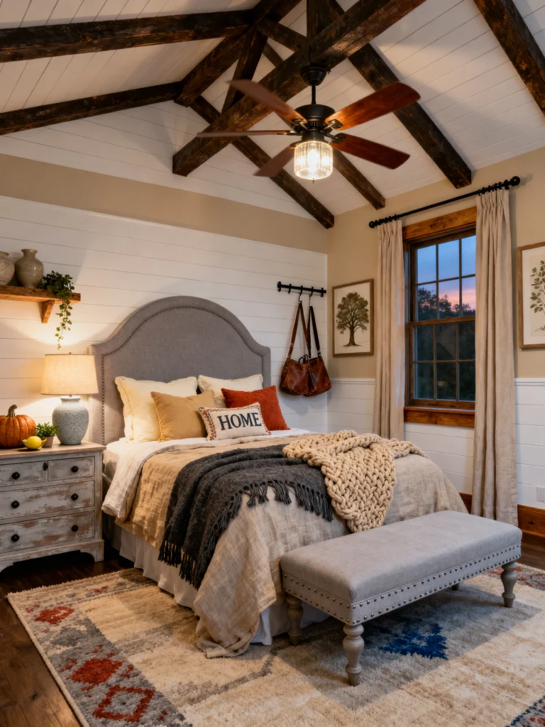 Check out the details here: the “HOME” pillow, the leather bags hanging on the wall, and the little pumpkin on the nightstand. It feels lived-in. The bed has a beautiful arched headboard that softens all the straight lines of the shiplap and the ceiling beams. It’s a great example of how you can take a “new” room and give it immediate character by using mismatched furniture, like that distressed white dresser. It’s soulful and sweet.