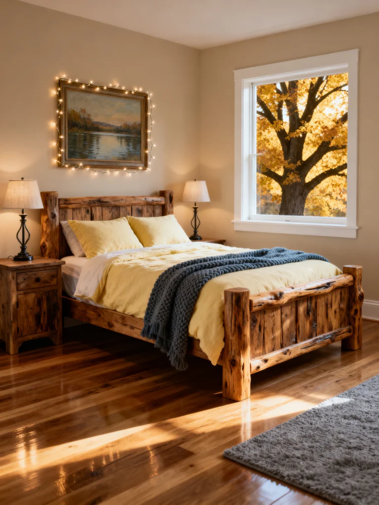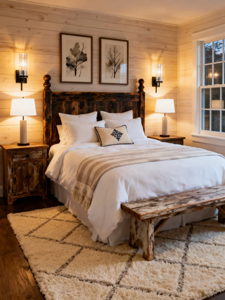 If “Shabby Chic” and “Industrial” had a baby, it would be this bedroom. Everything in here is about texture. Look at that headboard—it looks like it was reclaimed from an old barn and just barely sanded down. It’s raw and beautiful.