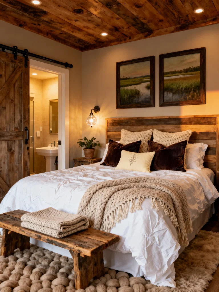 There’s a lot of clever stuff happening here. The sliding barn door leading to the bathroom is a classic rustic staple, but it’s done so well here. I also love the “chunky” theme they have going on—the oversized knit blanket on the bed matches the texture of that incredible bobble-knit rug on the floor. It looks like walking on clouds! The warm amber glow from the globe sconce by the bed makes the whole room feel like it’s permanently set to “Golden Hour.”