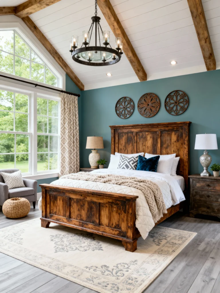Who says rustic has to be all beige and white? This room is a masterclass in using color to create mood. That deep teal accent wall is a bold choice, but because the rest of the room is filled with warm wood tones, it doesn’t feel cold. It feels like a cozy cocoon. The bed frame is heavy, reclaimed wood with a lot of “story” in the grain, which balances the smooth, modern finish of the wall.